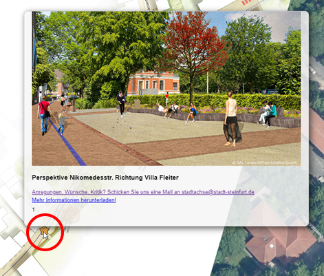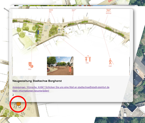 Klick auf Punkt => Ausschnitt von Gesamtplan oeffnet sich, unter dem Bild sind Links zum Beteiligungsformular und zu mehr Informationen